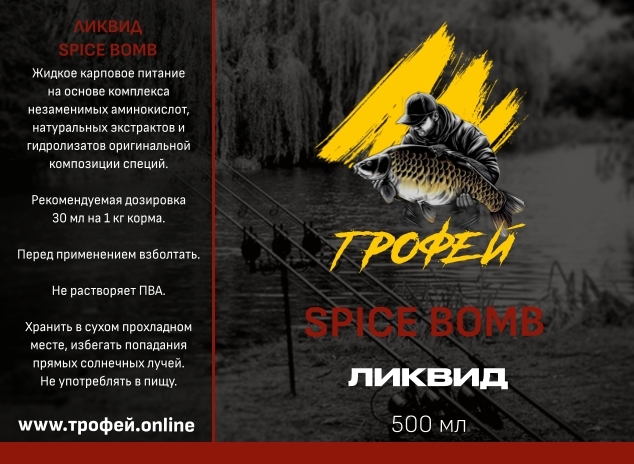 Ликвид Spice Bomb — специализированная жидкая добавка, созданная по авторскому рецепту, для карповой рыбалки с интенсивным пряным ароматом. Создана для максимальной активации интереса рыбы в сложных условиях ловли, когда требуются сильные, нестандартные стимулы. Эффективен круглый год. Основные характеристики: