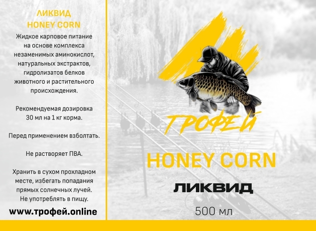 Ликвид Honey Corn— ароматизированная жидкая добавка с сочетанием медовых и кукурузных нот. Предназначена для привлечения карпа и амура. Отличается натуральным профилем и высокой аттрактивностью в тёплой воде. Основные характеристики: