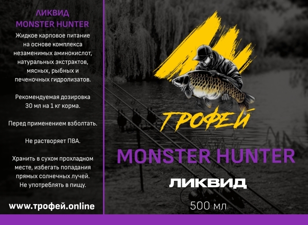 Ликвид Monster Hunter — специализированная жидкая добавка для рыбалки с интенсивным ароматом "Монстр краб". Разработана для привлечения крупной рыбы за счёт мощного морского аттрактанта и питательного состава. Особенно популярна в карповой ловле по теплой воде. Основные характеристики: