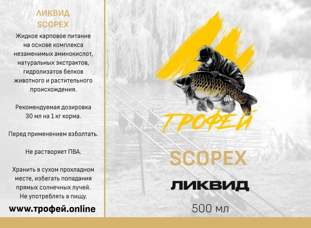 Ликвид Scopex — классическая ароматизированная добавка для рыбалки, ставшая отраслевым стандартом в карповой ловле. Обладает уникальным комплексным ароматом, который эффективно привлекает карпа и амура даже при низкой активности. Эффективен круглый год. Основные характеристики: