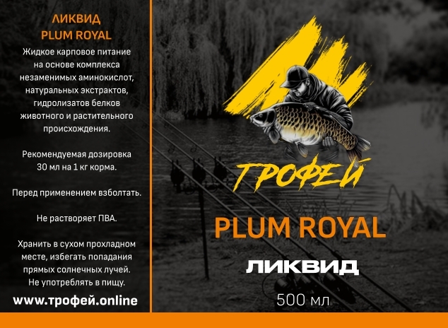 Ликвид Plum Royal — специализированная жидкая добавка для карповой рыбалки с ароматом спелой сливы. Продукт используется для пропитки бойлов, пеллетса, зерновых смесей и сыпучих прикормок, а также для создания влажных смесей с ПВА-материалами. Наиболее эффективен по прохладной воде. Основные характеристики: