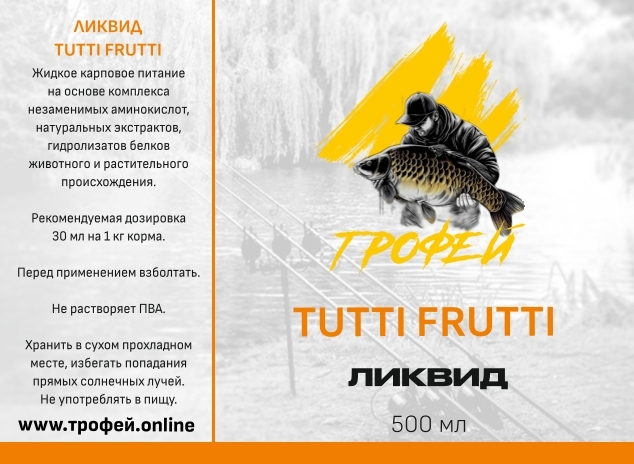 Ликвид Tutti Frutti — универсальная ароматизированная добавка с комплексным фруктовым ароматом, имитирующим смесь популярных сладких фруктов (ананас, клубника, банан, персик и др.). Предназначена для привлечения карпа и амура за счёт яркого, насыщенного запаха и вкусового профиля. Особенно эффективна в тёплое время года, при ловле вблизи камыша и водорослей. Основные характеристики:
