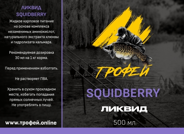 Ликвид Squidberry — специализированная жидкая добавка для карповой рыбалки, сочетающая морские и ягодные ноты. Название отражает композицию: «squid» (кальмар) + «cranberry» (клюква). Продукт предназначен для привлечения рыбы за счёт контрастного, запоминающегося аромата. Основные характеристики: