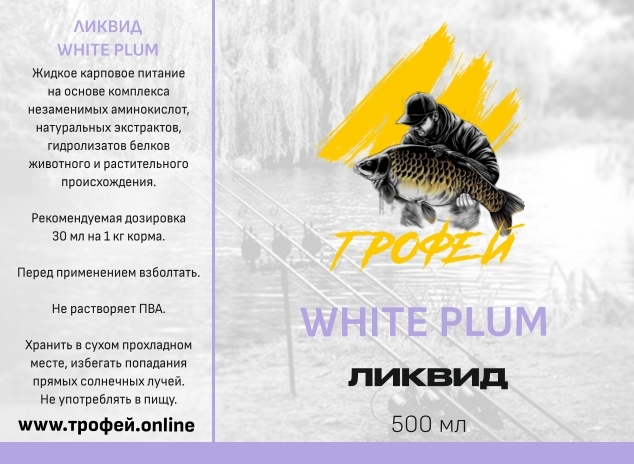 Ликвид White Plum — ароматизированная жидкая добавка с тонким, изысканным ароматом белой сливы. Предназначена для привлечения карпа и амура, особенно эффективна в прохладное время года и в периоды слабой активности. Отличается от классических сливовых ароматов более нежным, менее терпким профилем. Основные характеристики: