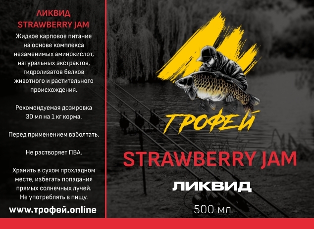 Ликвид Strawberry Jam — специализированная жидкая добавка для рыбалки, предназначенная для усиления привлекательности приманок и прикормок. Она обладает насыщенным ароматом клубничного джема, который привлекает карпа и других рыб семейства карповых. Продукт используется для пропитки бойлов, пеллетса, зерновых смесей и сыпучих прикормок, а также для создания влажных смесей с ПВА-материалами. Эффективен круглый год. Основные характеристики: